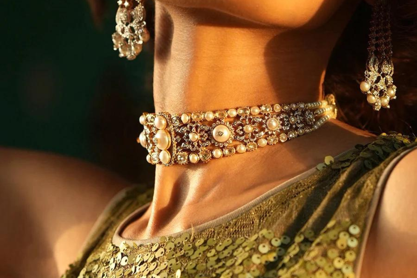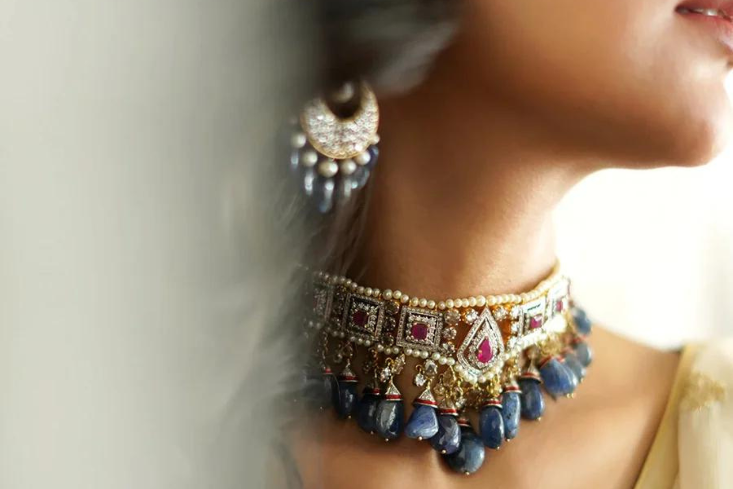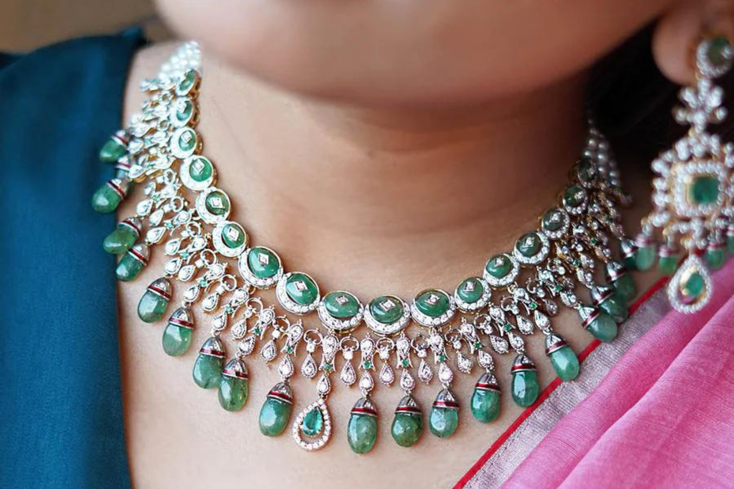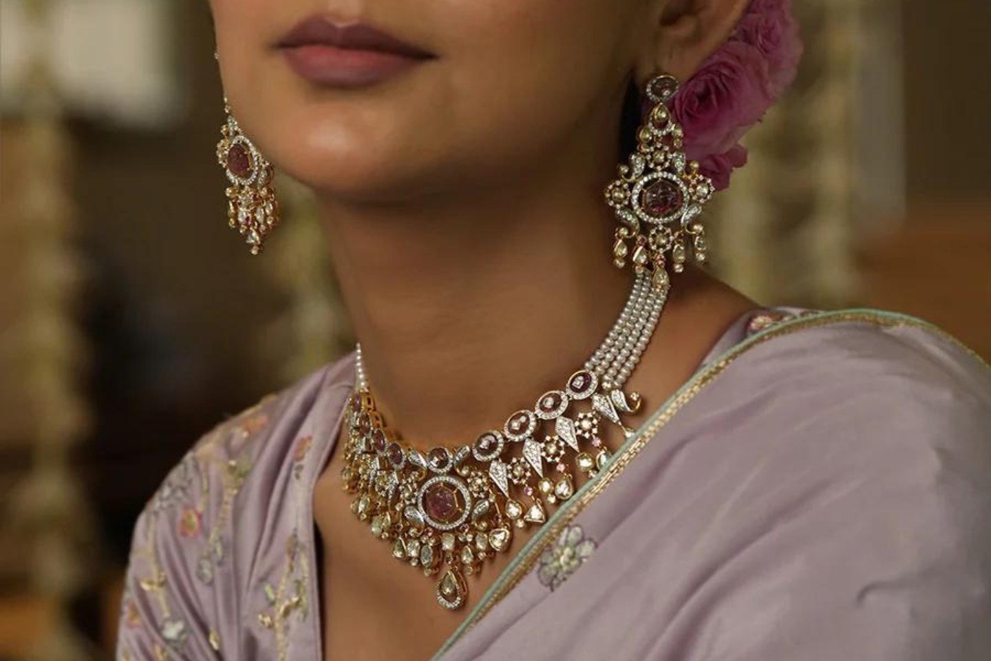 The options in Indian bridal jewelry are like a dazzling dream! From ornate gold sets to intricate Kundan pieces, the choices are endless. But the diamond necklace is like a shining star of the party. With its shine and shimmer, it captures the hearts of many perfectly complementing the grandeur of Indian weddings.
