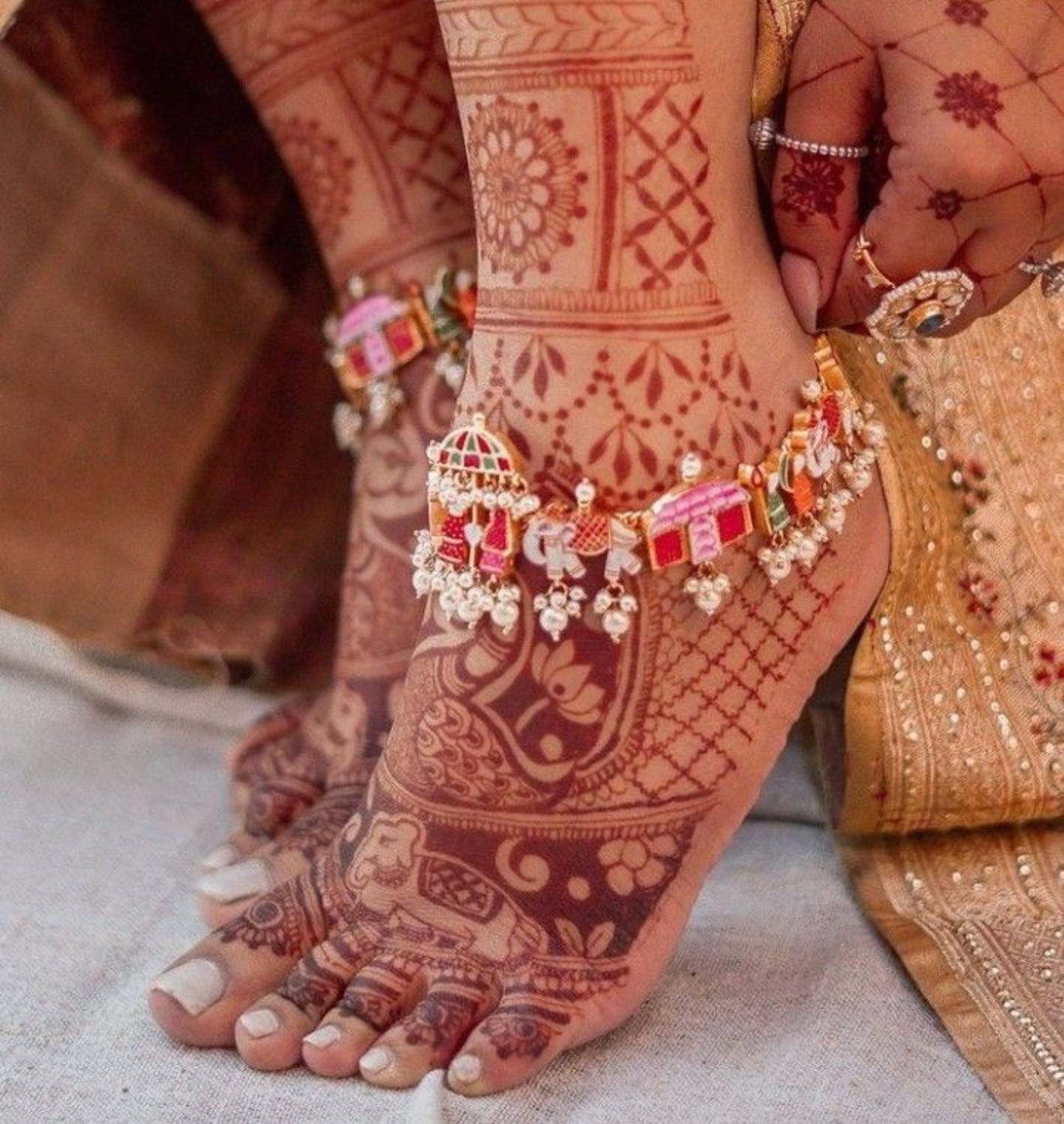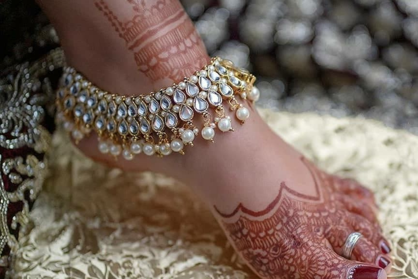 All of the elements used in this practice have been mindfully incorporated to accentuate a woman's well-being, social status, spiritual state, and future prospects. This also includes the anklet, a profound piece of traditional Indian bridal jewelry gracing the ankles of a woman.