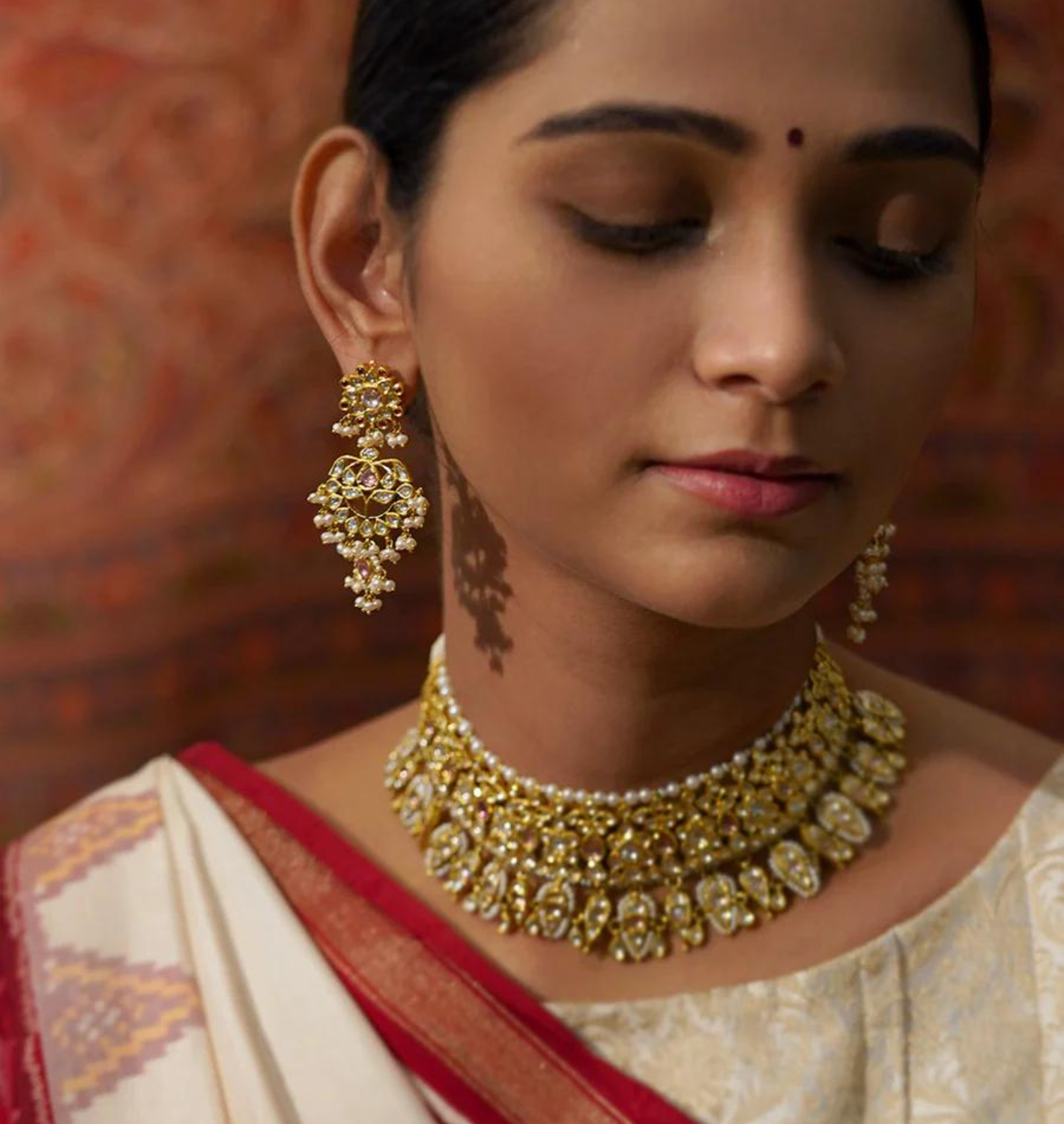 Your wedding outfit and Indian bridal jewelry are a match made in heaven, both incomplete without each other. Hence, while selecting your bridal jewelry, it's essential to consider how well it complements your chosen outfit. This leaves you with two ways, either harmonizing the jewelry with the outfit details to achieve a grand look or go for contrasting choices.