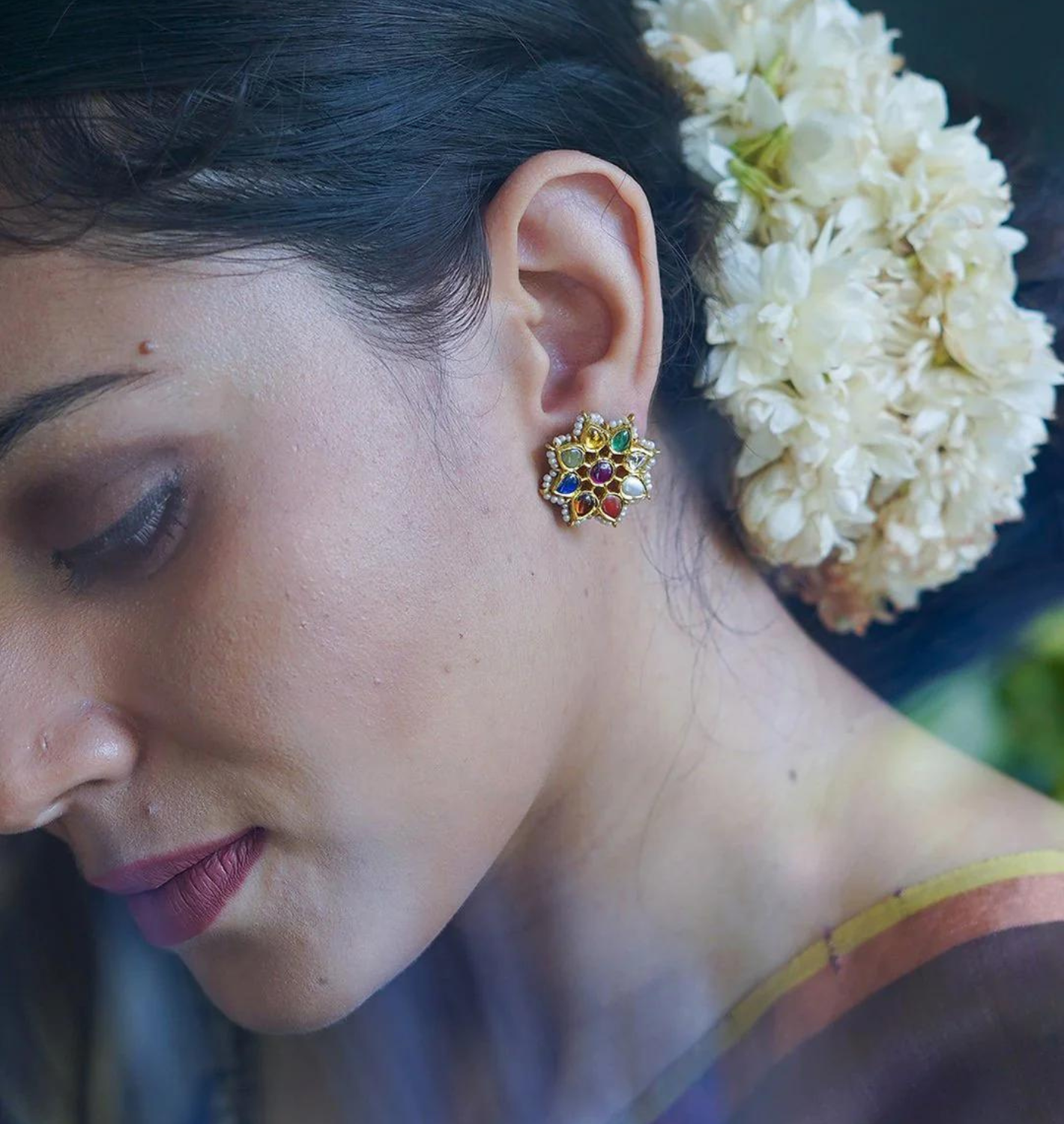 Navaratna earrings are the perfect mix of color and traditional significance. These Indian earrings are dressed in the auspicious nine gemstones—diamond, pearl, ruby, sapphire, emerald, topaz, cat’s eye, coral, and hyacinth/zircon.