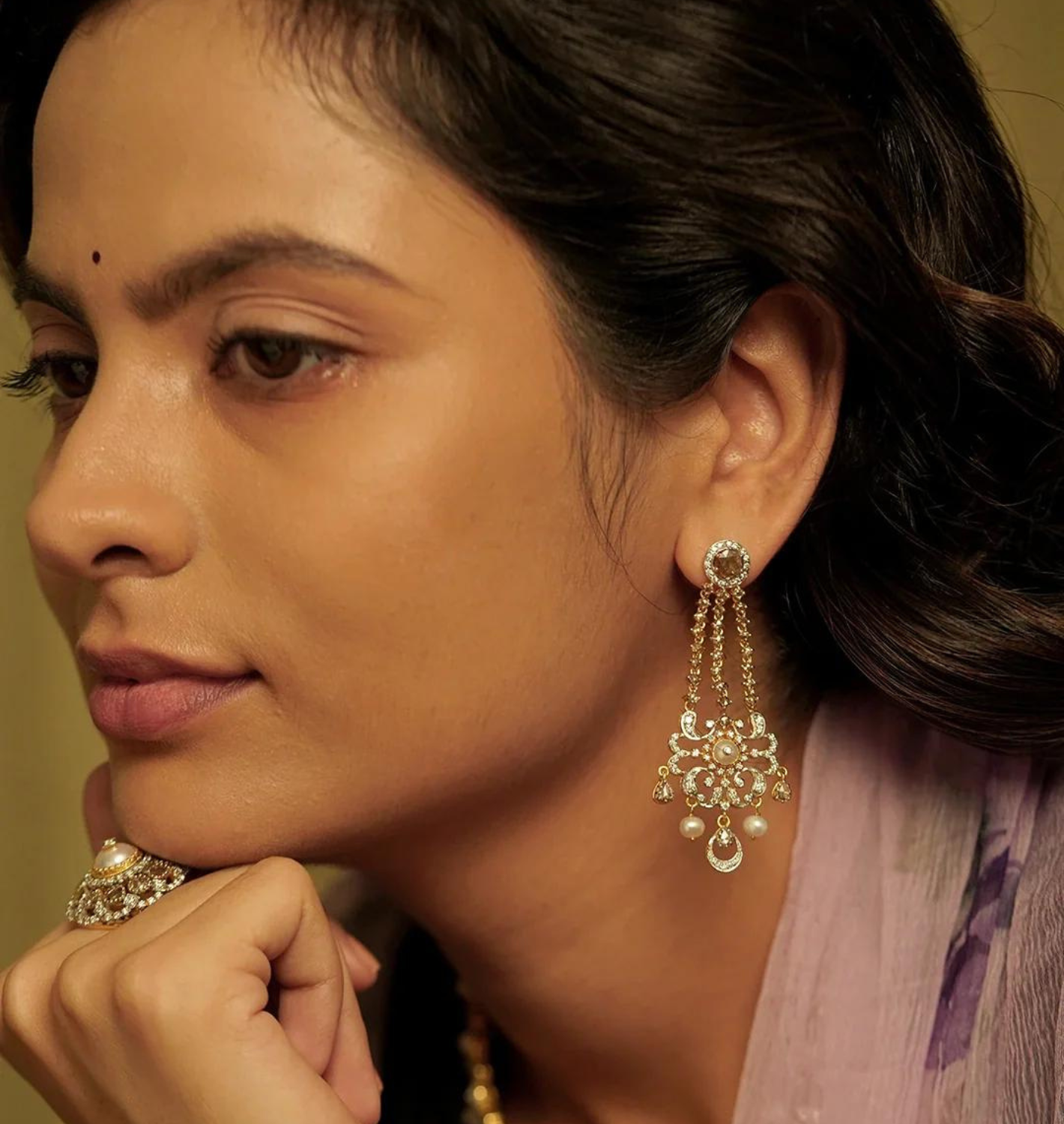If jhumkas and chandbaalis are the epitome of traditional grace, chandelier earrings are the epitome of contemporary elegance. They are fashionable and versatile; they can be paired as effortlessly with a traditional outfit as with a contemporary dress. Chandelier Indian earrings are ideal for somebody who’s looking for elaborate earrings with a modish touch.