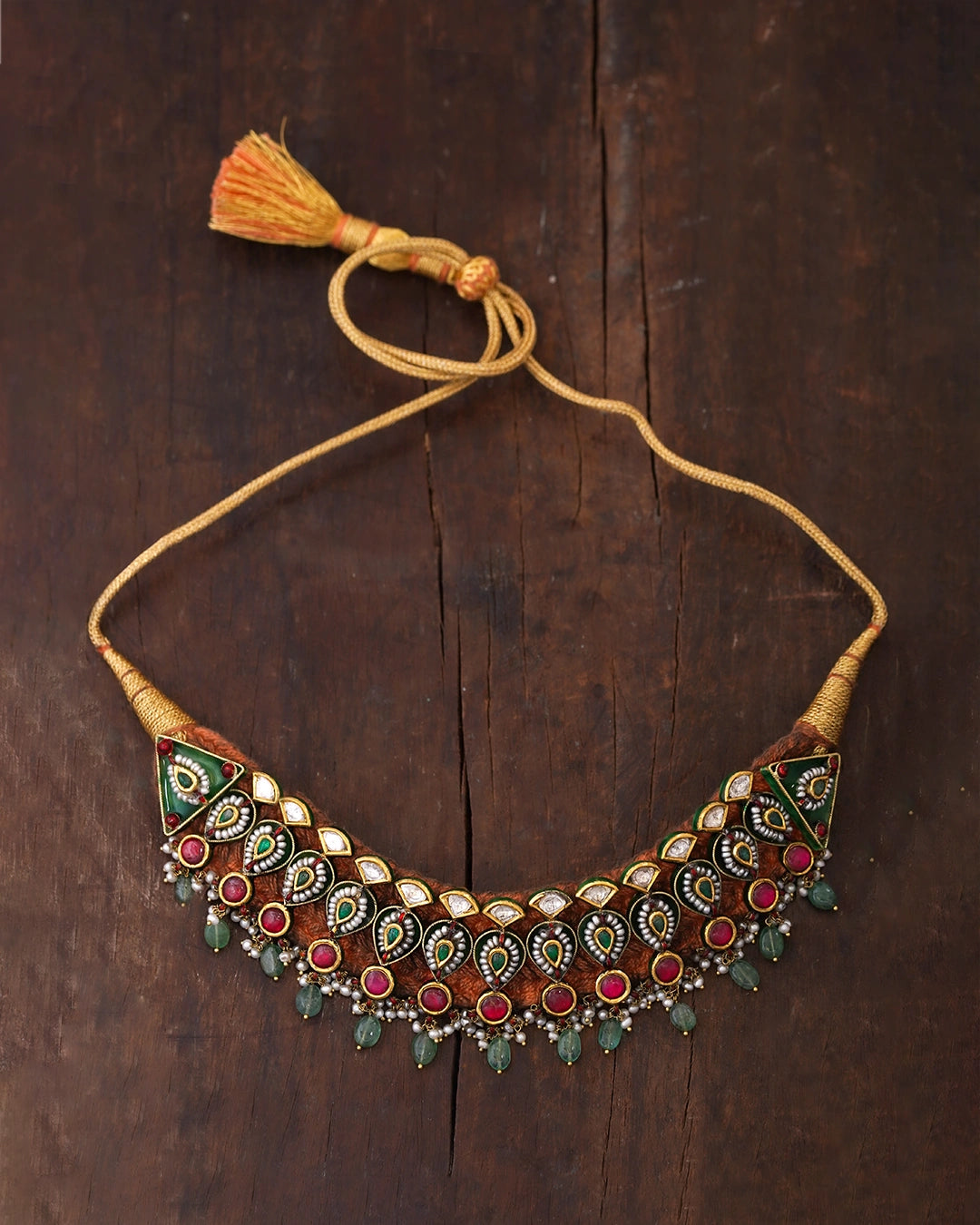 The choker necklace features repeating units handcrafted in gold and dressed in polki/uncut diamonds and colored gemstones using the traditional jadai technique. the units are sewn to a cushion-like base, called gaadi for added comfort. Drops of emeralds and seed pearl laria give the choker an air of movement.