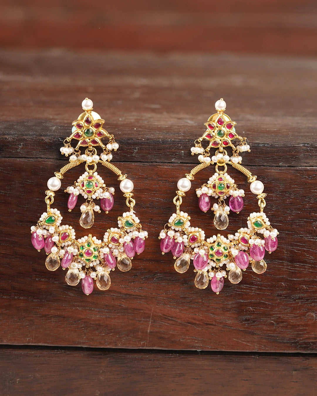 Designed with a quiet sense of romance, these handcrafted Kahini Chandbalis worked in gold are embellished with emerald and glass-filled ruby gemstones. Soft pastel drops of citrine and pink tourmaline introduce a contemporary lightness, adding graceful movement with every turn. Inspired by the ornate naths worn by Indian brides, these are earrings designed to make heads turn. A perfect way to elevate your ensemble during destination nuptials.