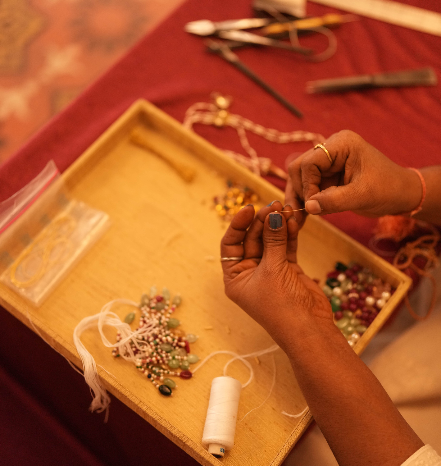 They experienced the magic of gemstones and pearls, the sukshma hero of ornaments; the beauty of the nuances of the ghat (the gold framework into which the stones are set); the adaa in different elements stringing such as fungar—tiny gold cups cradling pearls topped with enamel beads, laria—minute units where seed pearls dance on small gold wires, gracefully culminating in enamel beads at their feet, pirai—stringing together seed pearls and/or stone beads to either border a unit or be suspended, giving movement to the piece; and the nuances that go when assembling a accessory (adding a gaadi behind a choker, for example).
