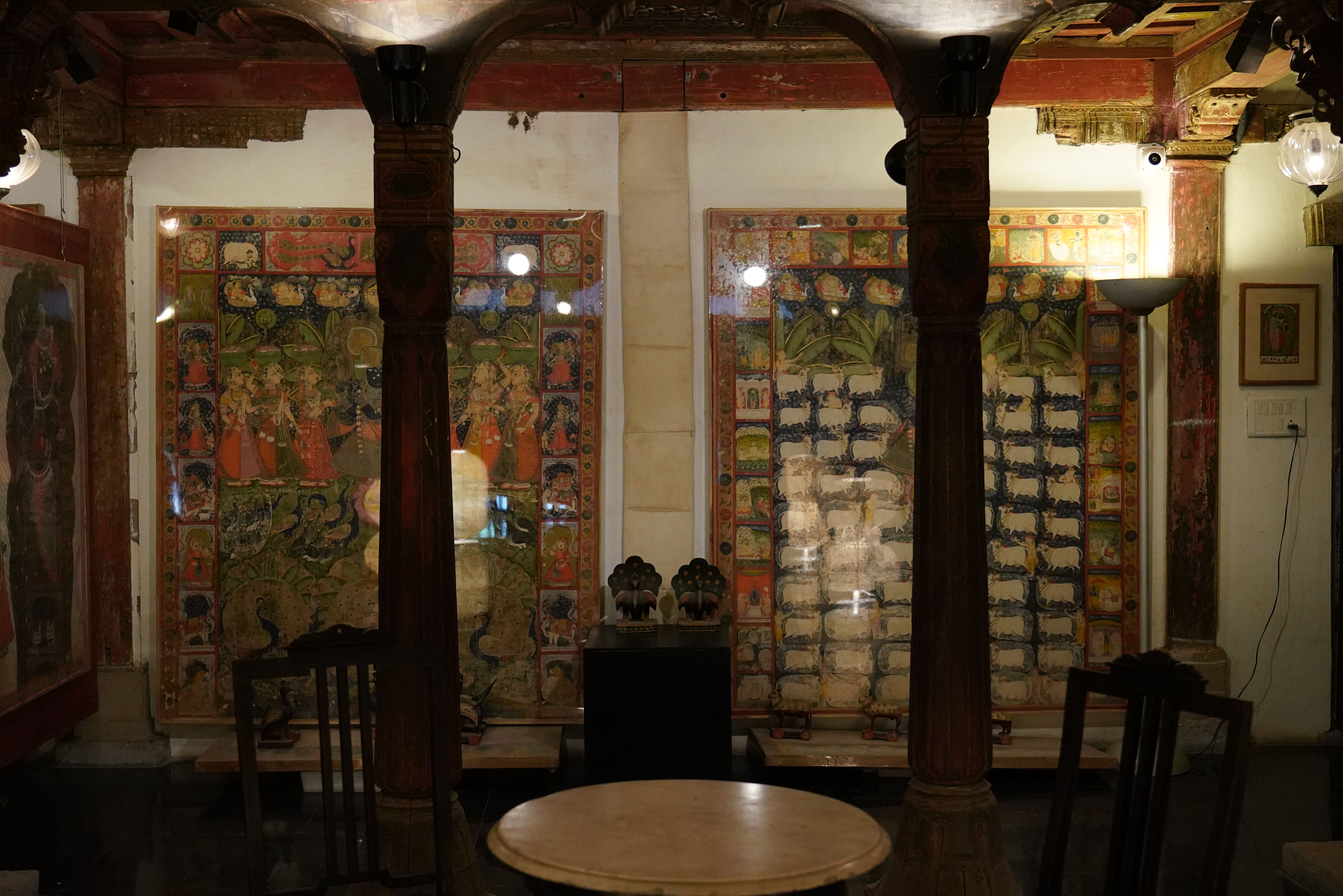 We had the fortune of visiting the Hussain-Doshi marvel, the Amdavad Ni Gufa, and having it to ourselves for almost an hour, and setting our eyes on the unreal Kamal Chowk, a reconstructed, and re-imagined pre-Mughal period mandapa originally crafted by the skilled stone artisans of Patan, now converted into a contemporary display space for Pichwais and miniatures from Amit Ambalal’s collection.