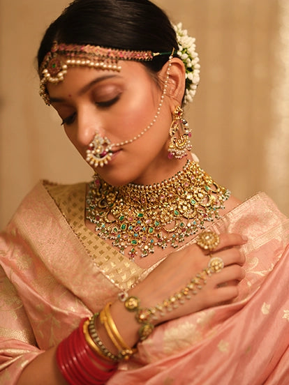 Soaked in the warmth of festive colors and glimmering with the richness of gold, this collection reflects the many hues and silhouettes of an Indian bride—from the sublime ivory to the whimsical pastels, and the opulent reds and gold. Colorful gemstones and symbolic motifs, come together to paint a picture as rich and magnificent as weddings in India.