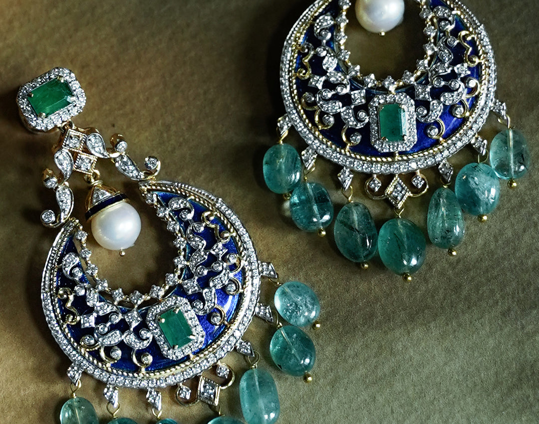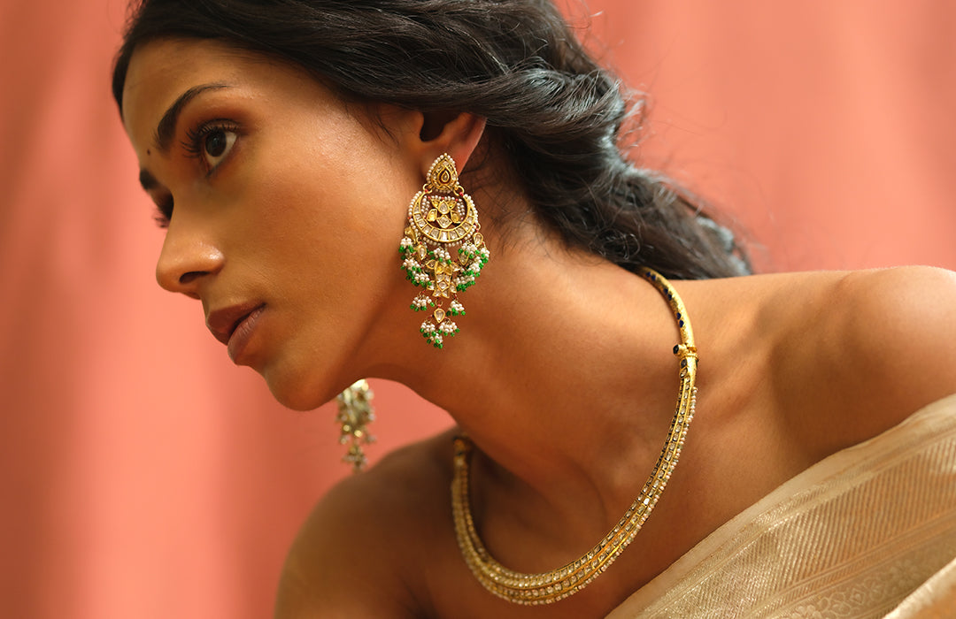 Celebrating a harmonious duet of art and glamour, Gilded Grace is built on the idea of creating a bold statement through understated grace. Hints of champlevé meenakari and chudiwork highlight the quiet radiance of uncut diamonds romancing the charm of a glorious past.