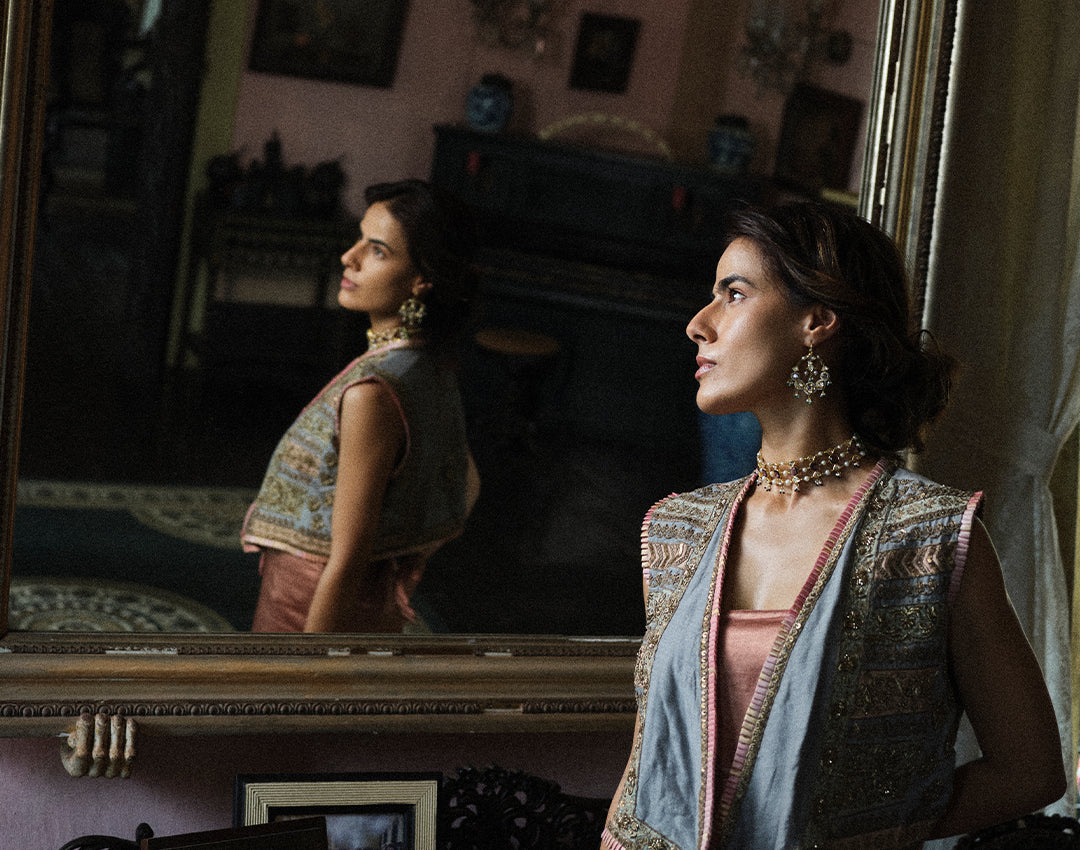 SAJJA is a journey through the beauty of craftsmanship, where age-old techniques and traditions are put forth in a modern-day avatar. Be it the bandhani blending in seamlessly with the many amulets of the symbolic Kaliganthi, the intricate nath and Mohanmala gracing the iconic Nauvari saree, each ensemble is a celebration of India's diverse cultural expressions.