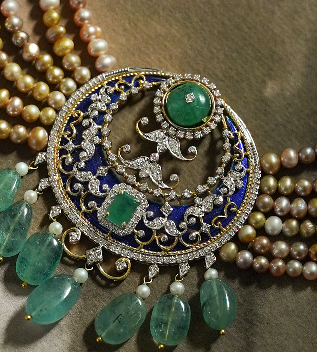 Suspended in the threshold of here and there, each jewel becomes a passage. Through layers of luminous enamel beneath a constellation of gems, they glow like light through stained glass windows, hues of blue, green and the pink sky.