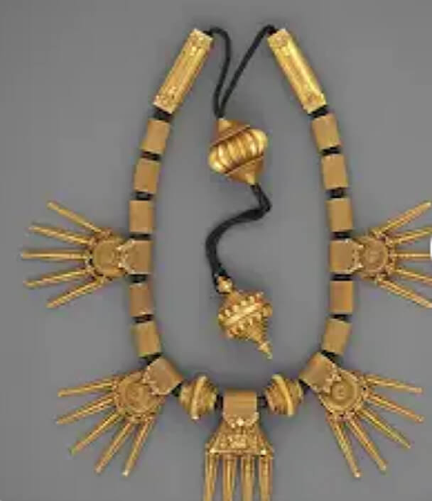 The kasunala is a necklace made by stringing identical coins ver closely, often engraved with motifs and is an important part of the wedding trousseau. it became popular during the period of roman trade. the necklace is one of the most striking examples of ornaments serving as an instrument of saving.