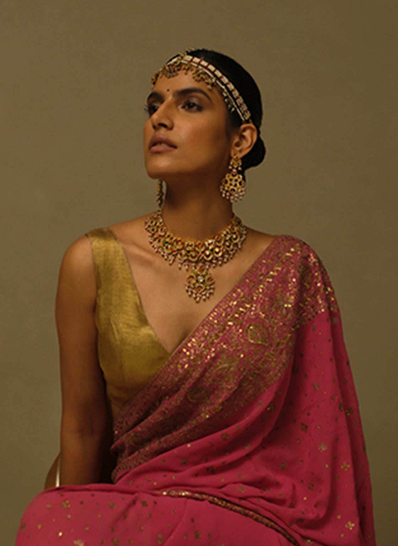 Choosing the right combination of necklaces, earrings and other jewellery is an art, very much like styling a saree or lehenga with the right blouse, dupatta or belt! Ideally pick a jewellery piece that you want to highlight, it could be a necklace, a couple of nicely styled layered necklaces or a pair of statement earrings paired with a maangtika or a mathapatti.